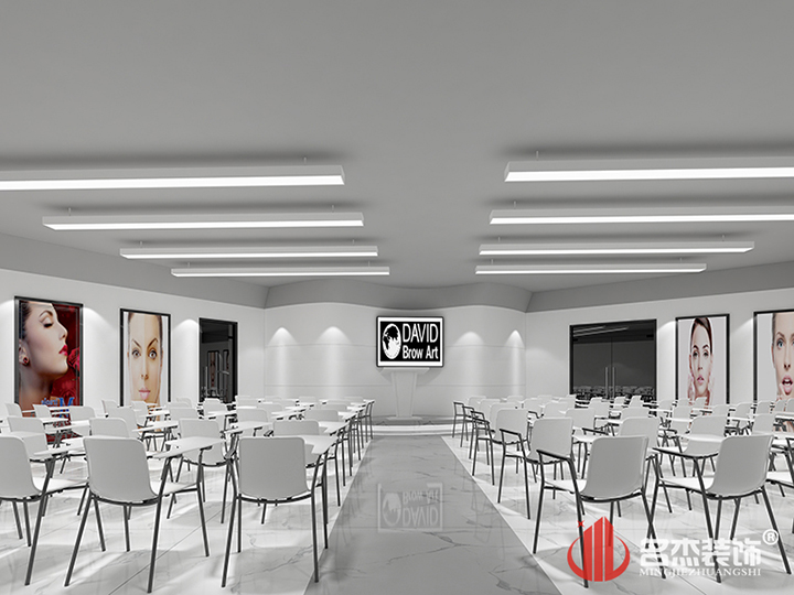 设计说明:使用白色作为主色调,结合风格强烈的装饰画来为整个空间添加时尚感,利用圆弧形来避免整个空间过于单调,让整个美容院装修设计处于一种简约而时尚的平衡中