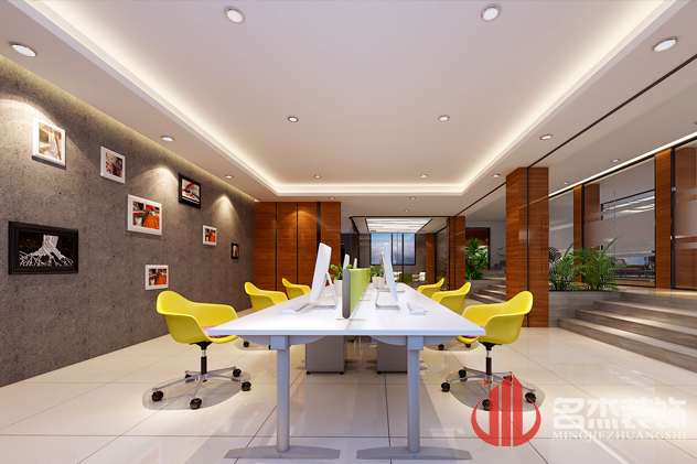 设计说明:本次办公楼装修设计案例办公室装修设计是整个办公室装修工程中的灵魂,办公室装修更需要科学、人性化的设计,合理的显示空间布局,充分利用办公空间资源,解决客户的功能要求。在会议室在平面设计功能上,考虑了合理的行动路线,以便于人员的走动,办公家具的选择充分考虑了培训及会议的机动性,在色彩方面以白、黄、灰色几种色彩的组合,虚实相应,使整个空间显得简练而具有动感。……